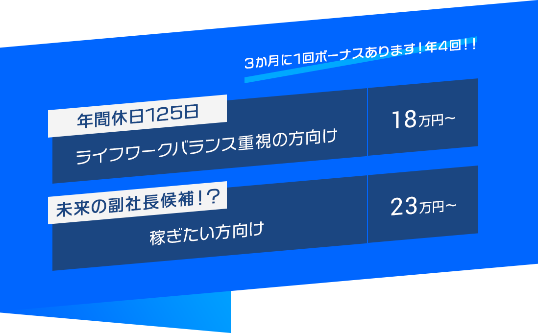 給与 | ①ライフワークバランス重視の方向け 18万円~ ②稼ぎたい方向け 23万円~ 試用期間(最短1ヵ月~最長3カ月)15万円~ |
